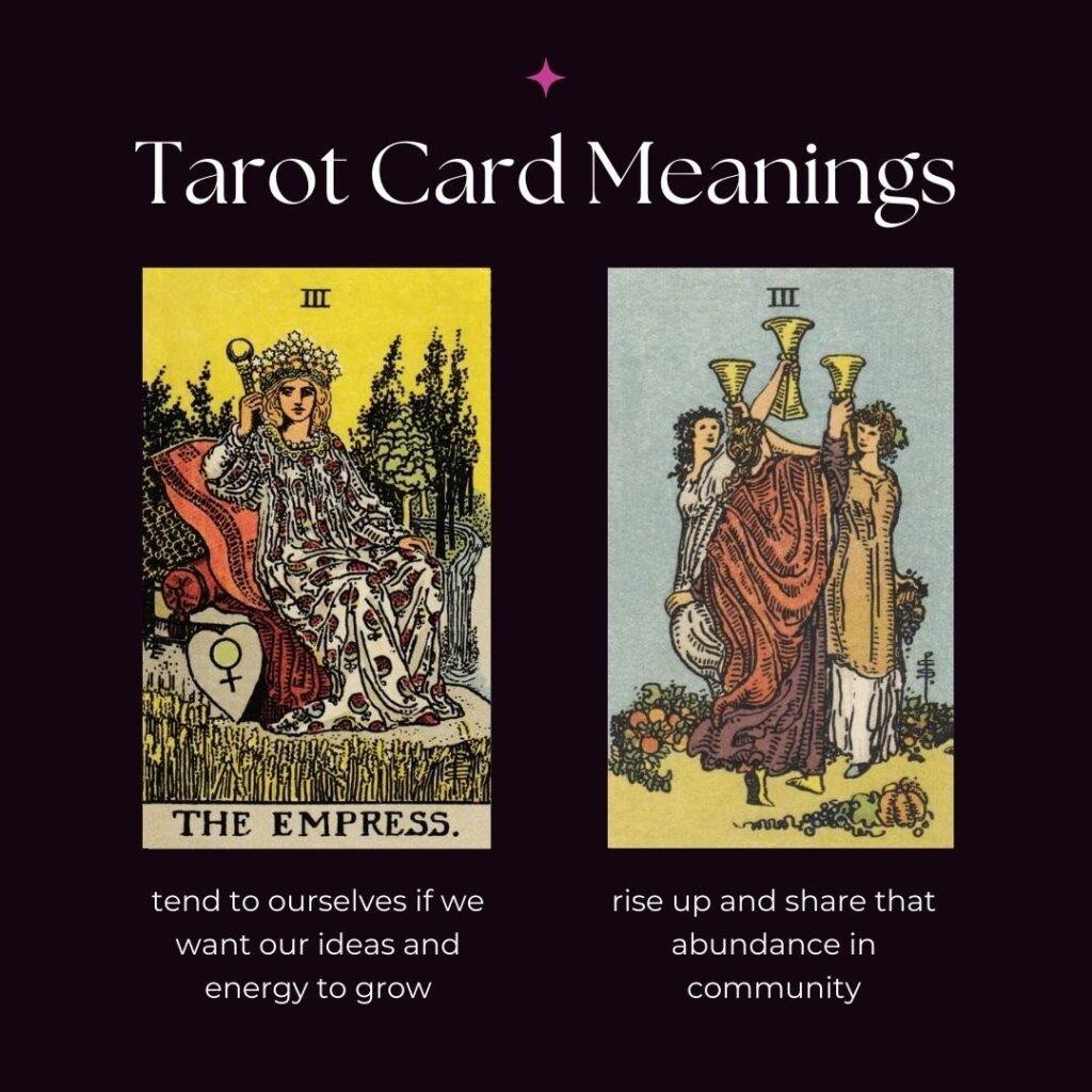 I always read tarot as a conversation with the soul, and The Empress spoke first — not just as a card, but as the Great Mother Earth herself. She whispered of care, creativity, and the importance of being nourished by beauty and nature. She reminded me that just as the earth tends her garden, we must tend to ourselves if we want our ideas and energy to grow. The Three of Cups then joined in, reminding me of the joy found in connection, celebration, and sharing our journeys with others. Together, they painted a picture of balance: The Empress asks us to root ourselves in self-care and natural rhythms, while the Three of Cups invites us to rise up and share that abundance in community. Their combined message was clear — First fill your own cup with love and nourishment, and only then can you pour joyfully into the cups of others.